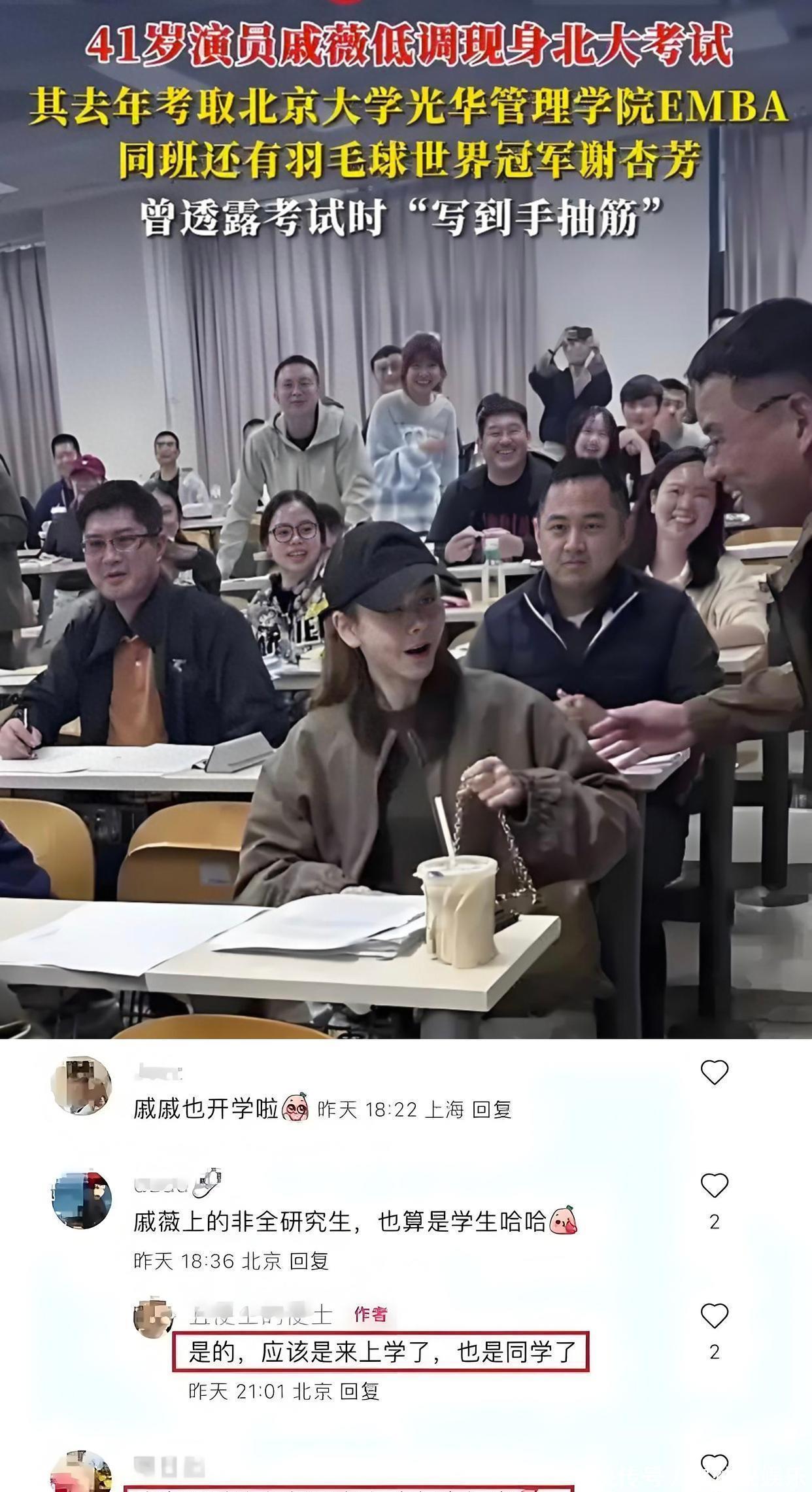 据悉,戚薇于2024年考取北京大学光华管理学院EMBA项目,为非全日制研究生,研究方向聚焦“场景新消费”。此次现身校园,正是来参加课程考试的。